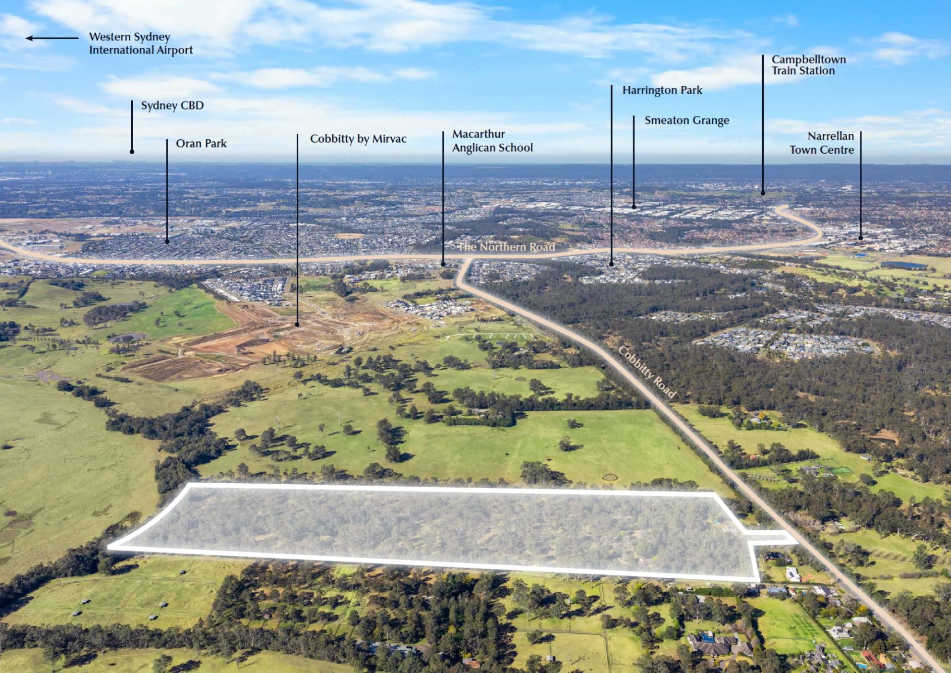 18.5* km to Western Sydney International Airport, 55* km to Sydney Kingsford Smith Airport, and 67* km to the Sydney CBD. Located outside the sub-20,000 ft airport flight path.