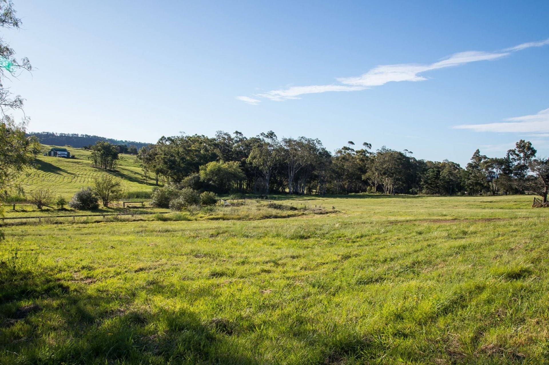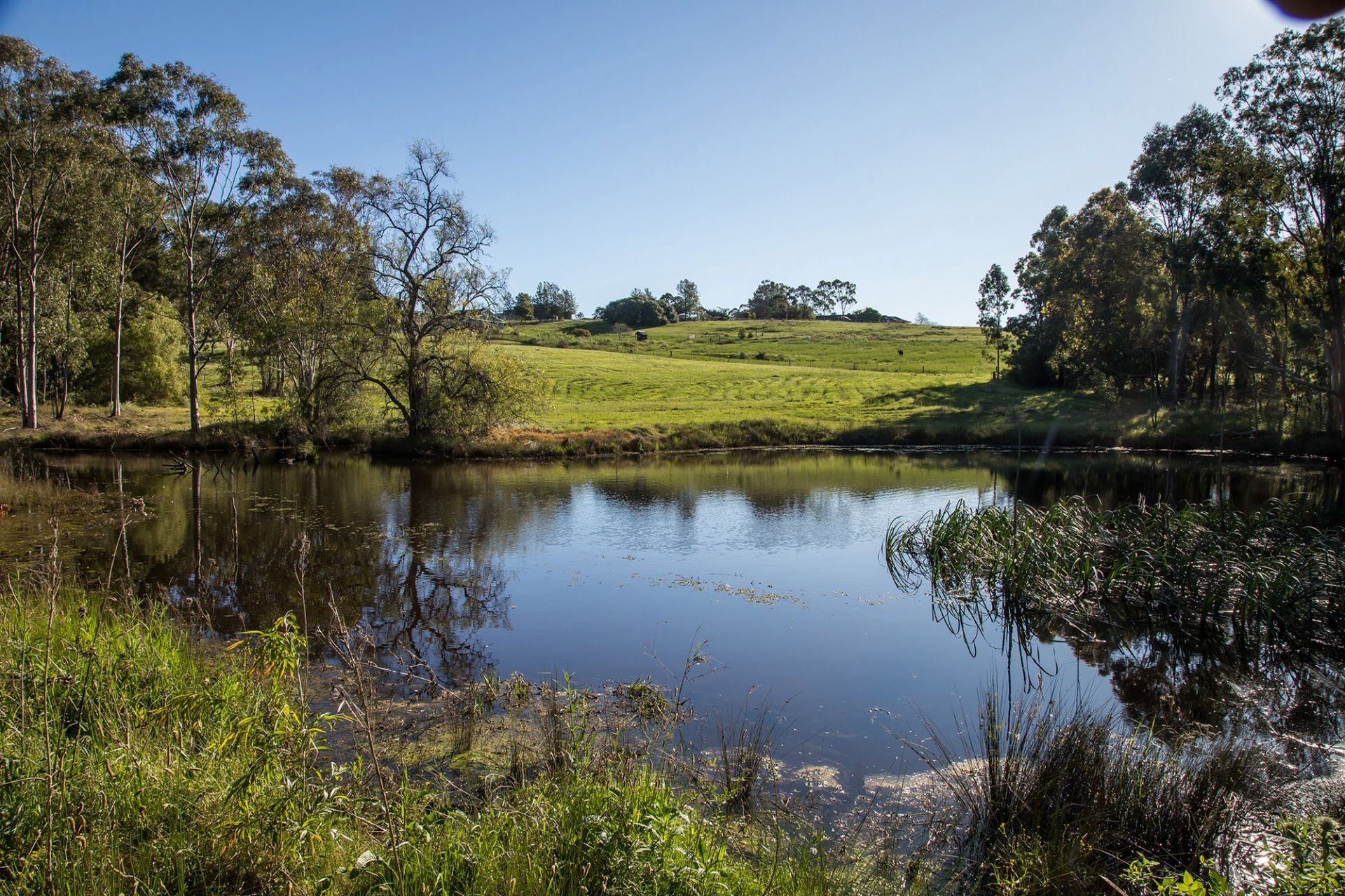 The gently sloping and mostly cleared land features three picturesque dams framed by mature native gums, creating a peaceful haven for wildlife, enhancing the estate's natural beauty.