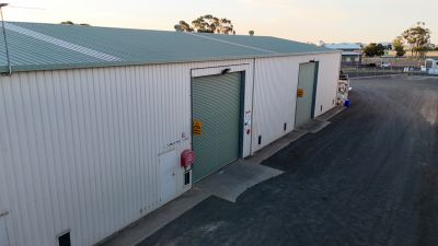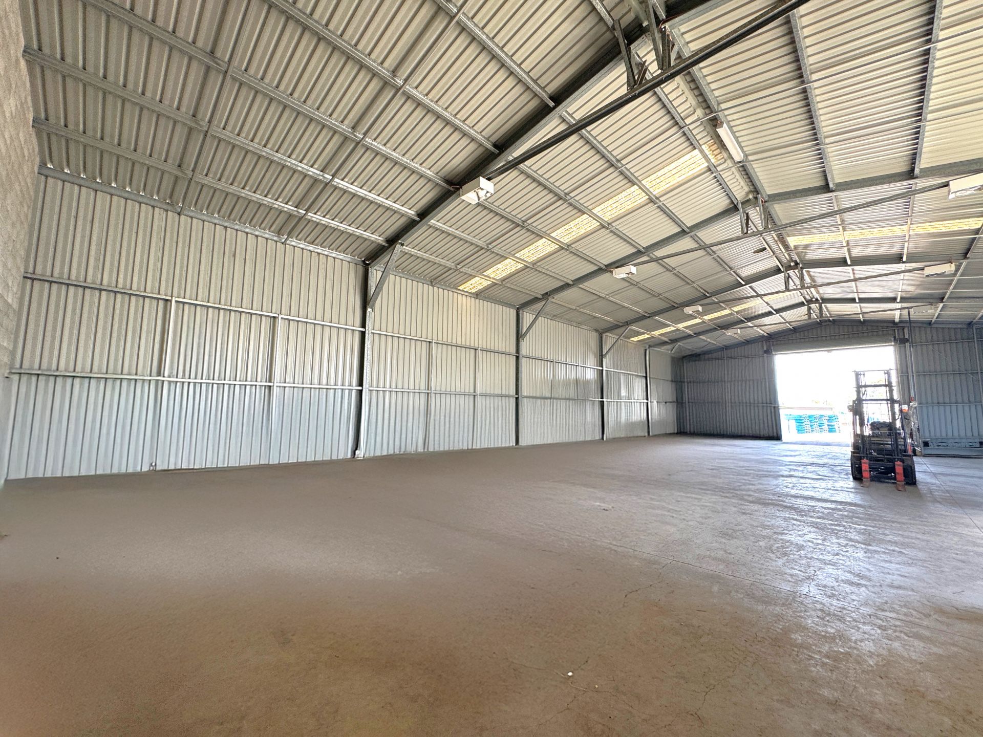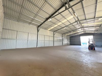 A modern steel frame construction warehouse with concrete slab hardstand throughout and easy access via 3 high clearance roller doors, overhead lighting, and 3 phase power access.