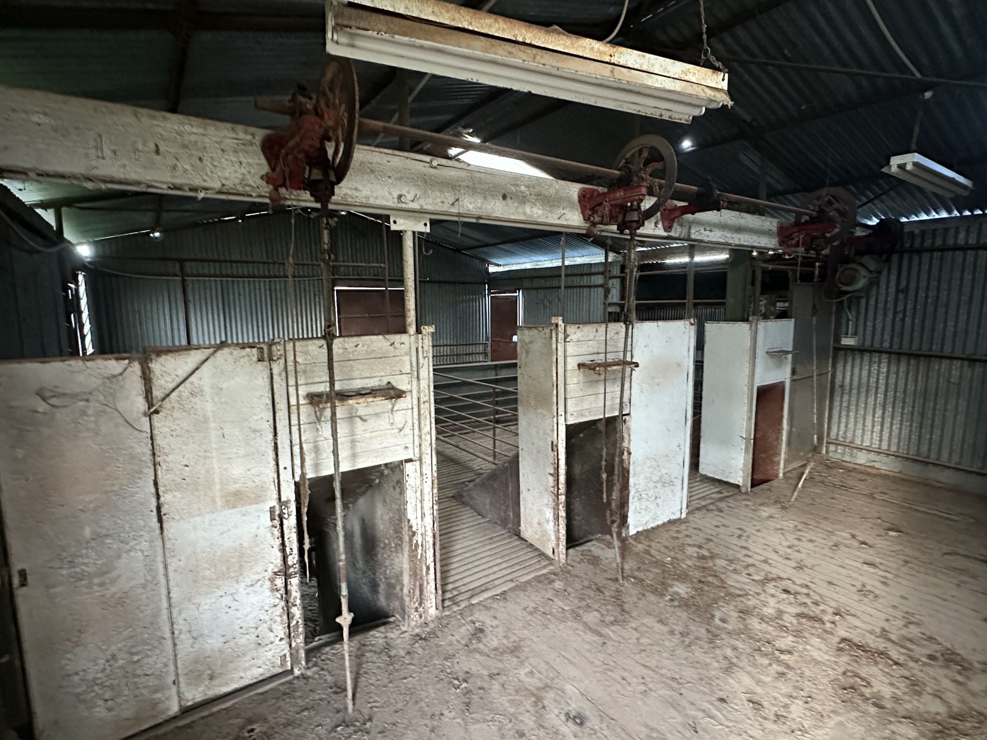 A four-stand shearing shed and sheep yards, with power connected to an ideal homestead site surrounded by established trees.