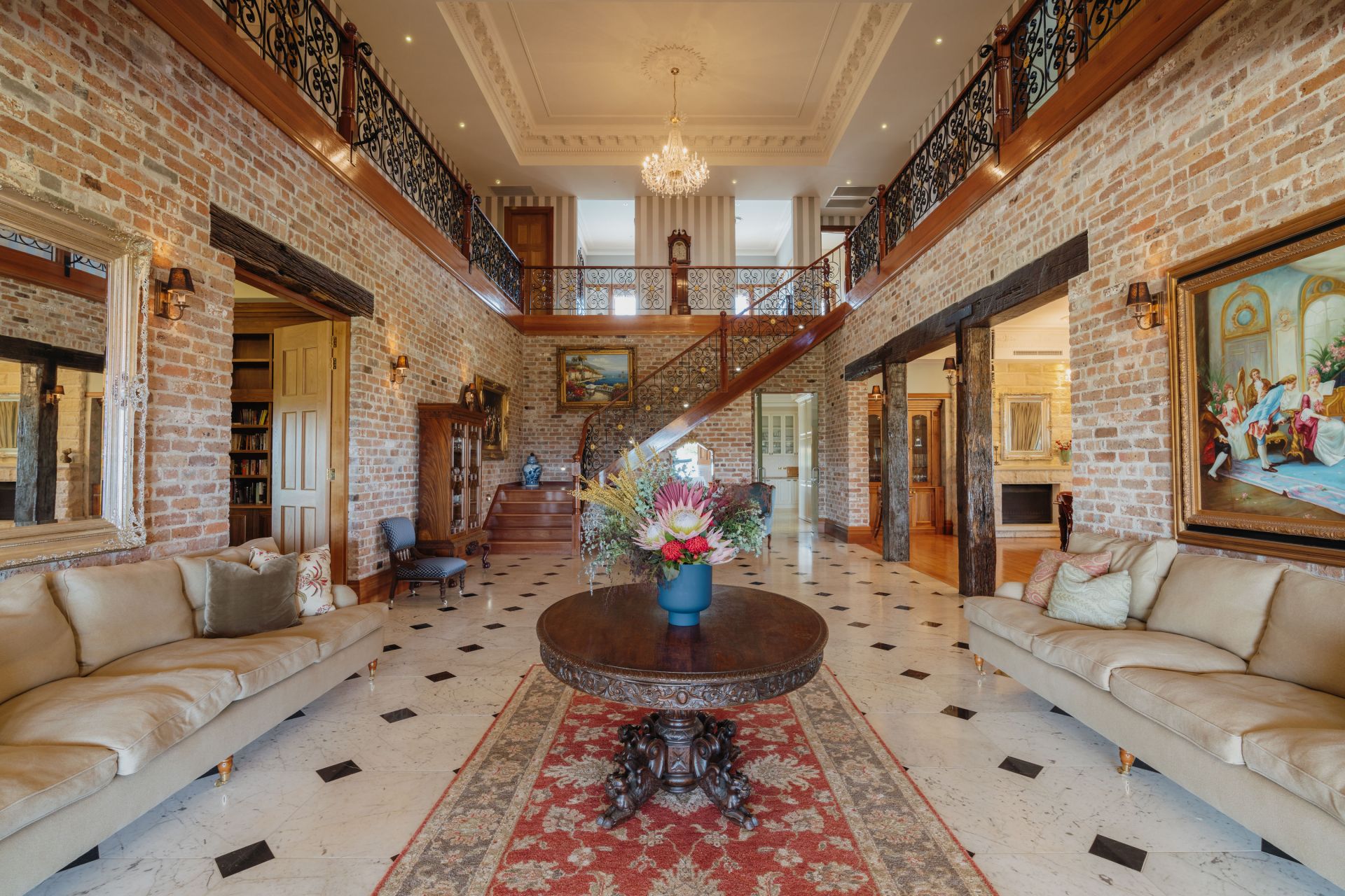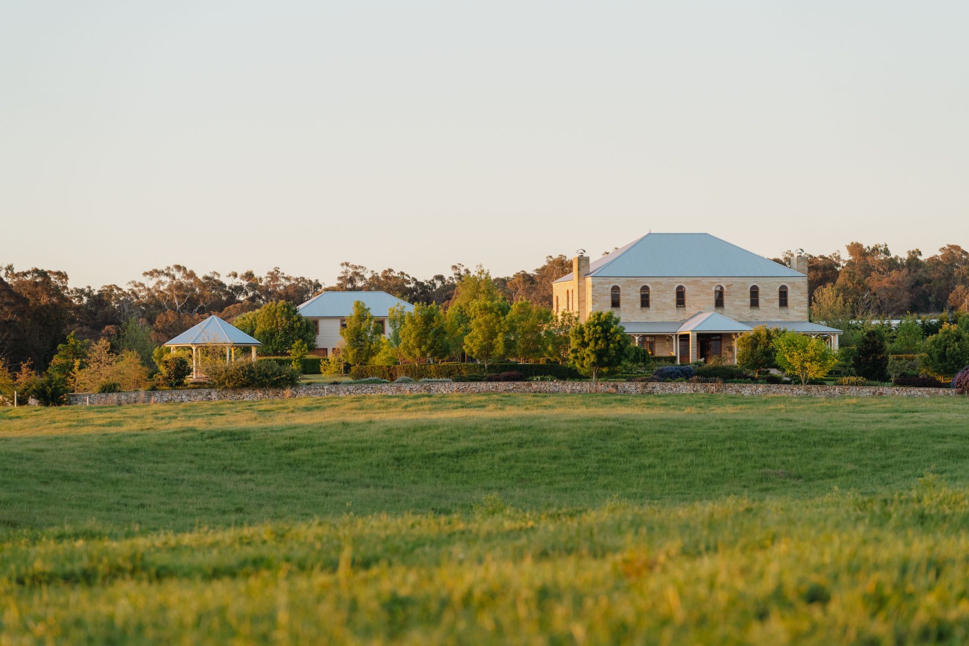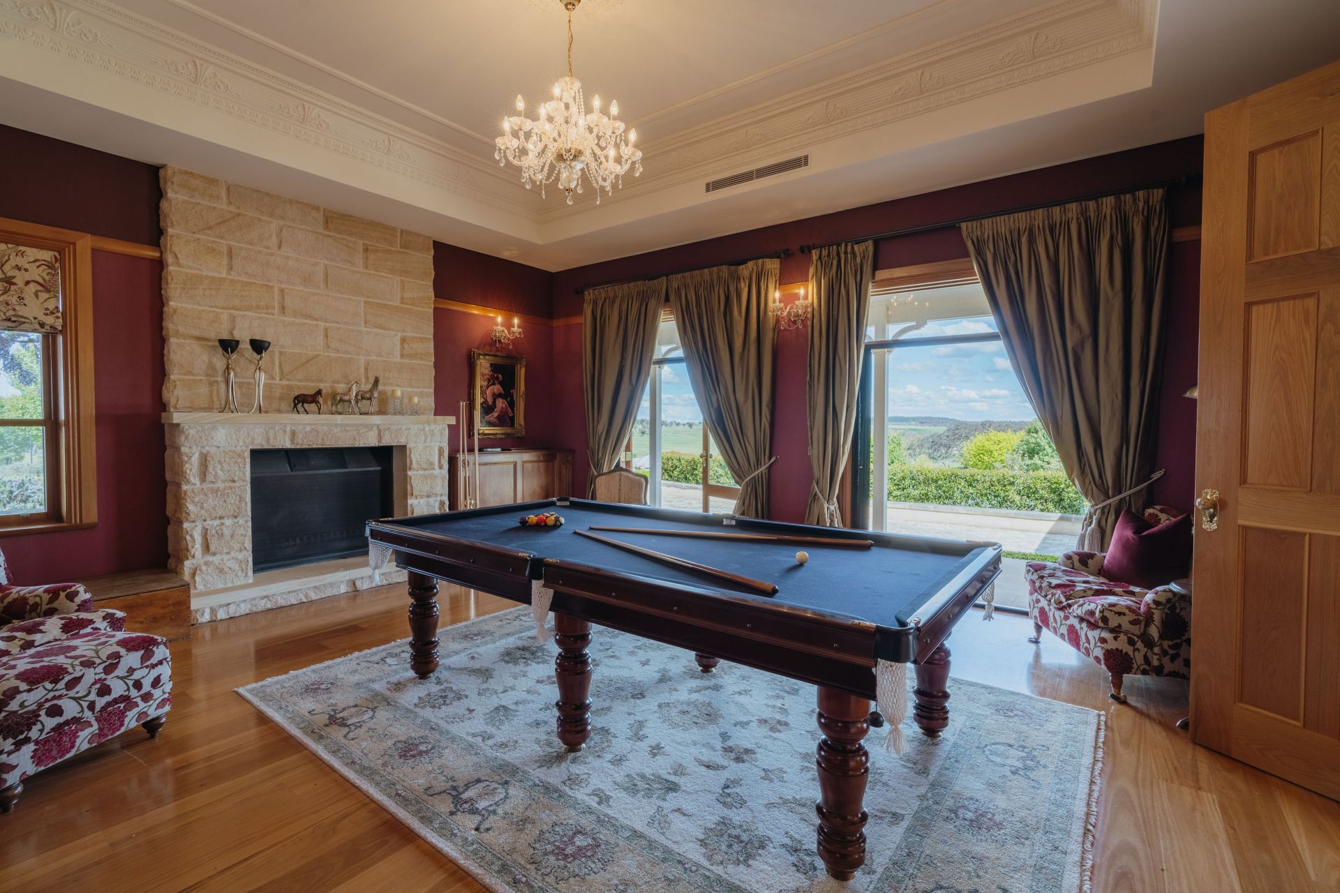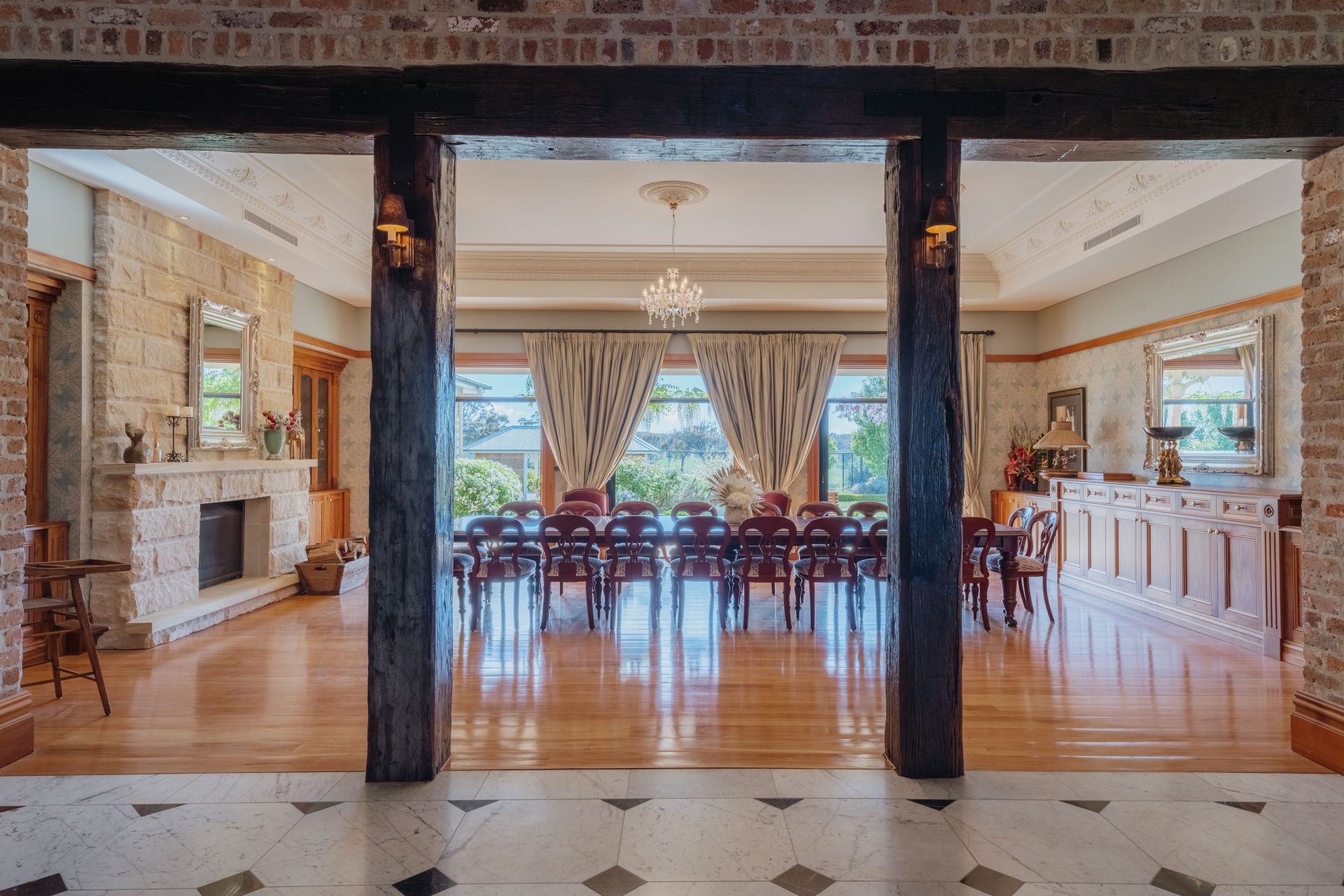 The significant two-storey, 6-bedroom homestead includes 5 bathrooms (3 ensuites) and features extensive joinery, exposed timber beams from Pyrmont bridge and 20 spacious rooms. Includes large double bedrooms, extended ballroom and a 23 seat formal dining room. The open plan kitchen and living extends to sunroom, study, billiards room and several informal sitting rooms.