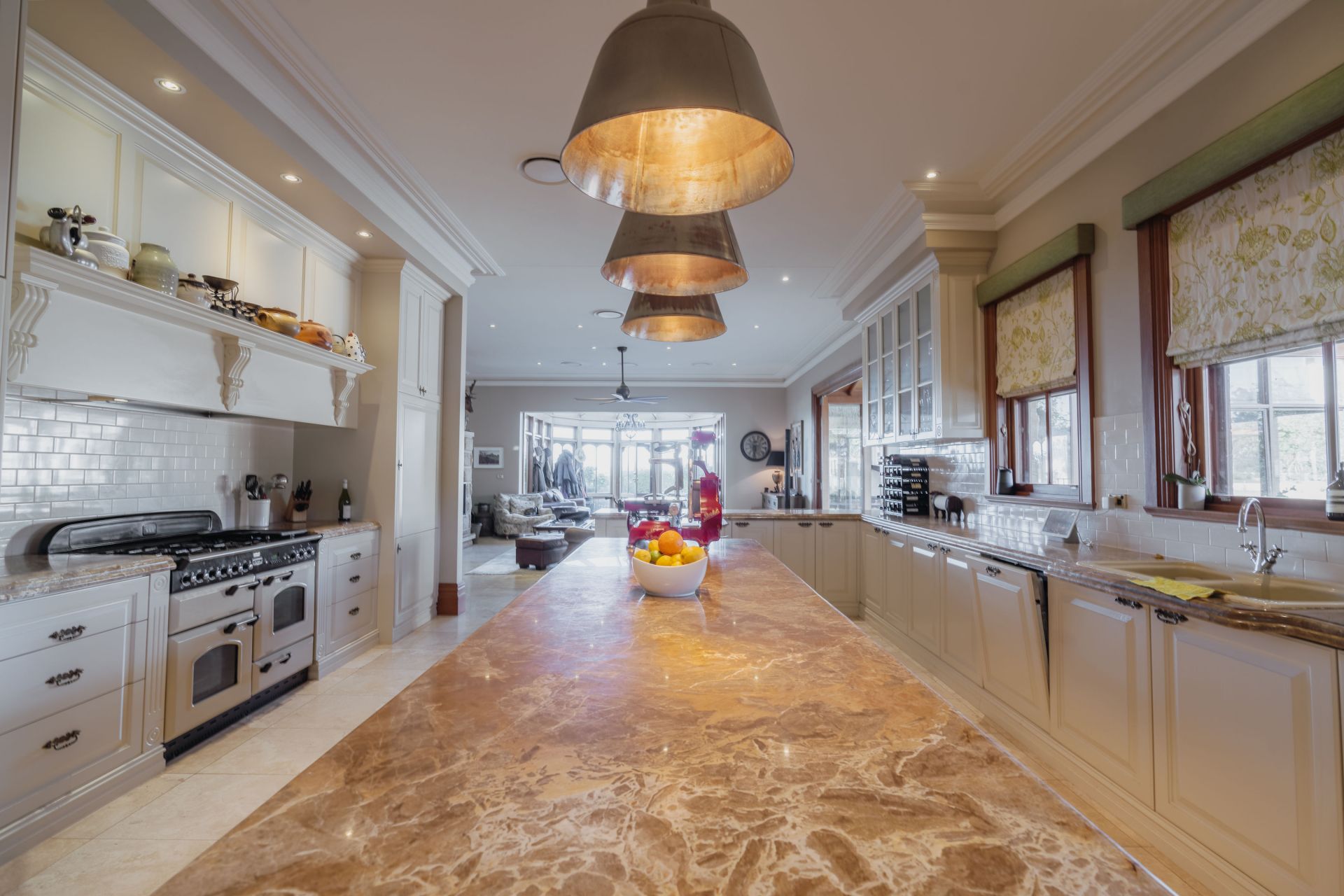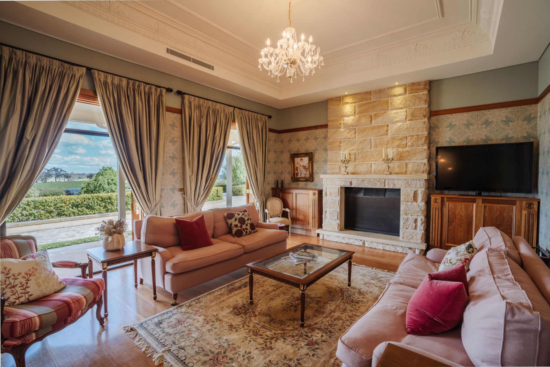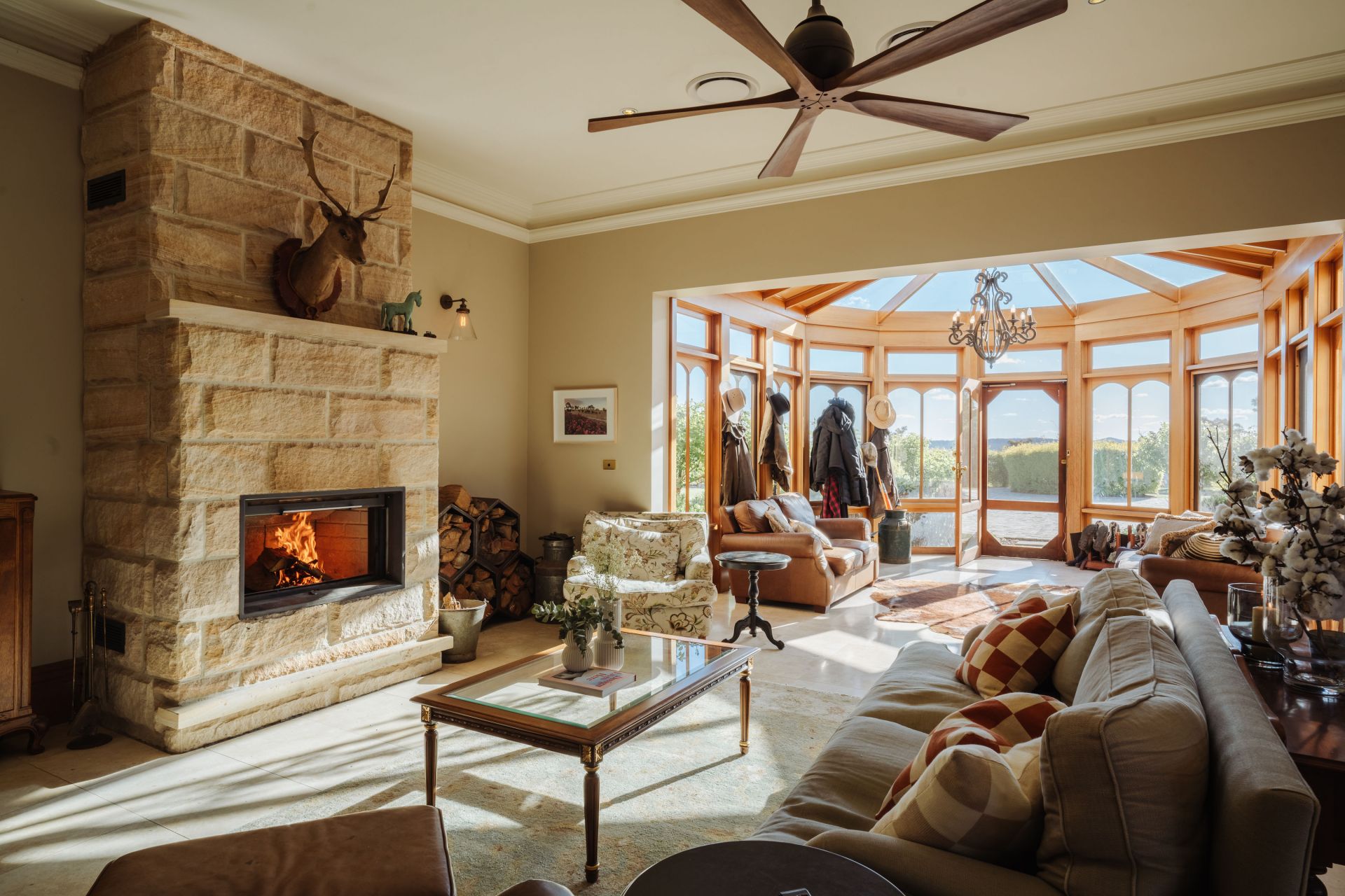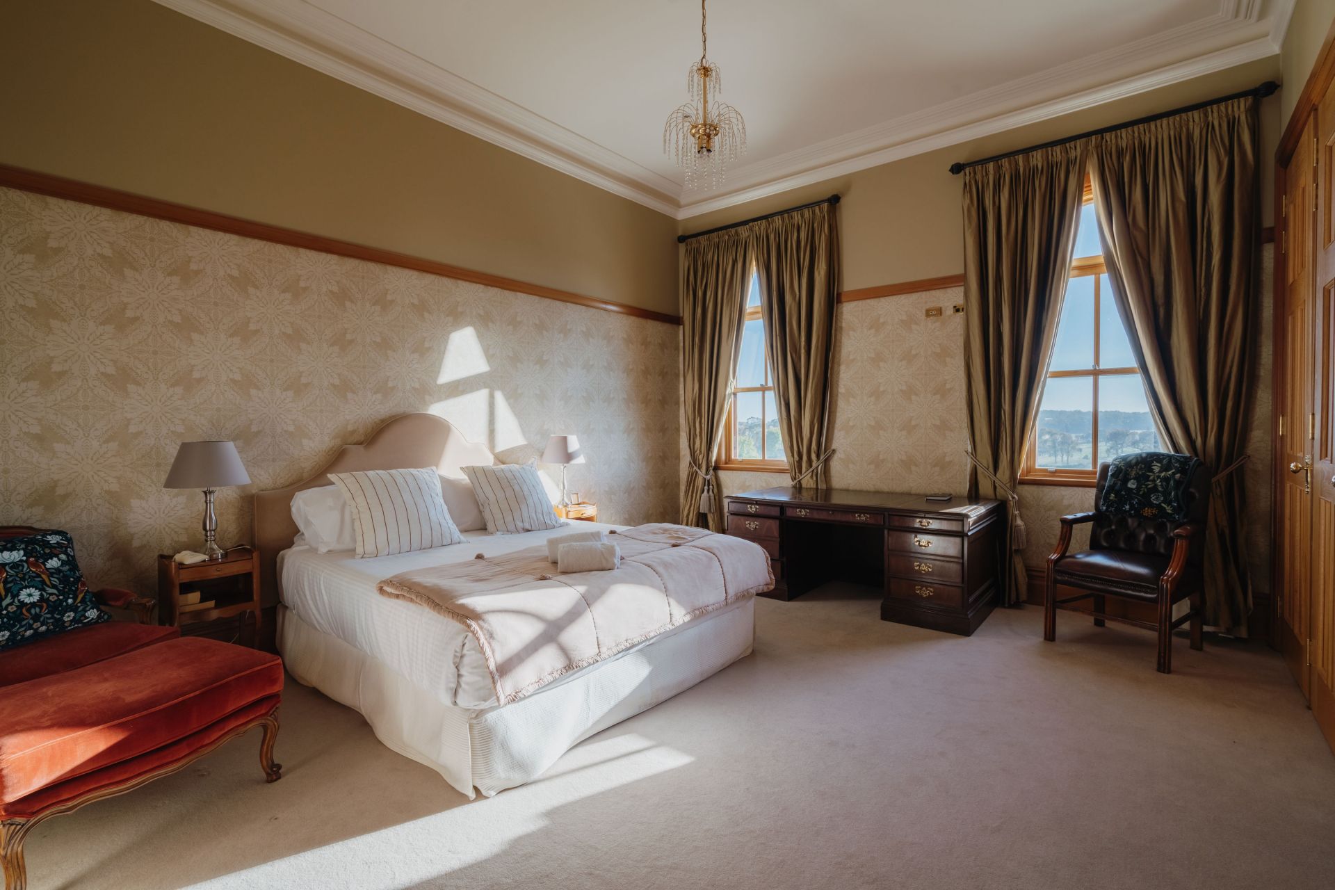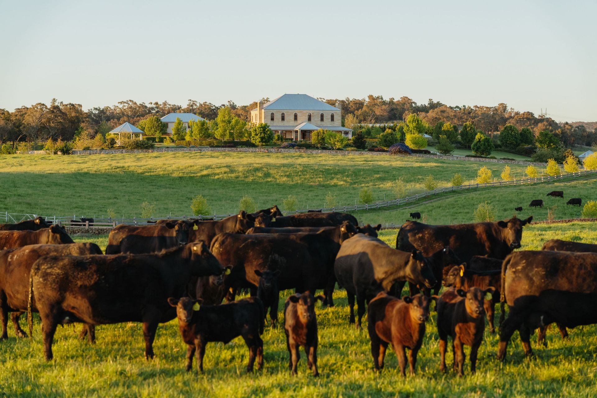 The significant two-storey, 6-bedroom homestead includes 5 bathrooms (3 ensuites) and features extensive joinery, exposed timber beams from Pyrmont bridge and 20 spacious rooms. Includes large double bedrooms, extended ballroom and a 23 seat formal dining room. The open plan kitchen and living extends to sunroom, study, billiards room and several informal sitting rooms.