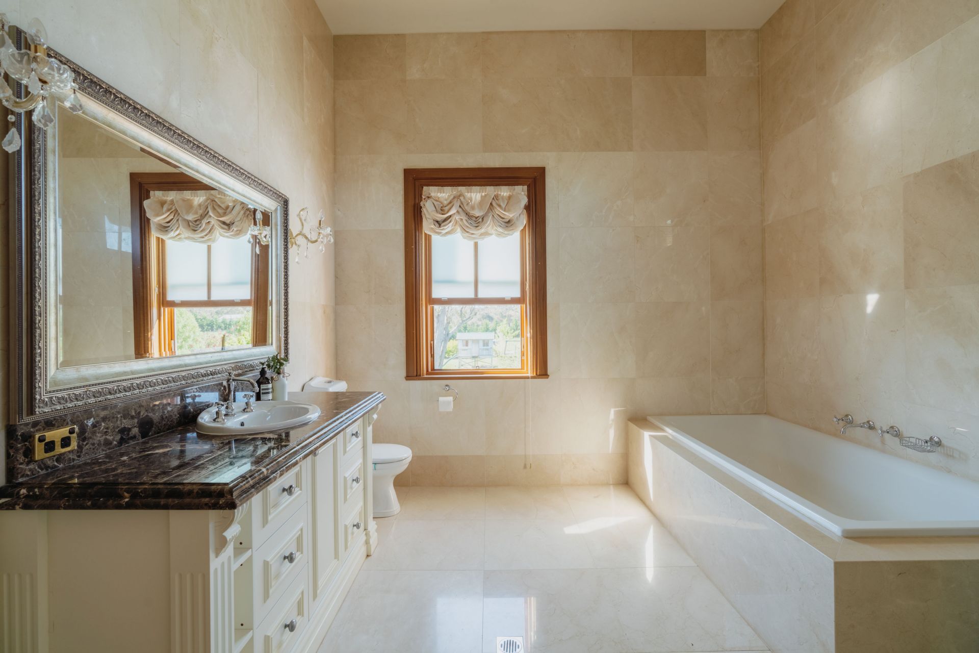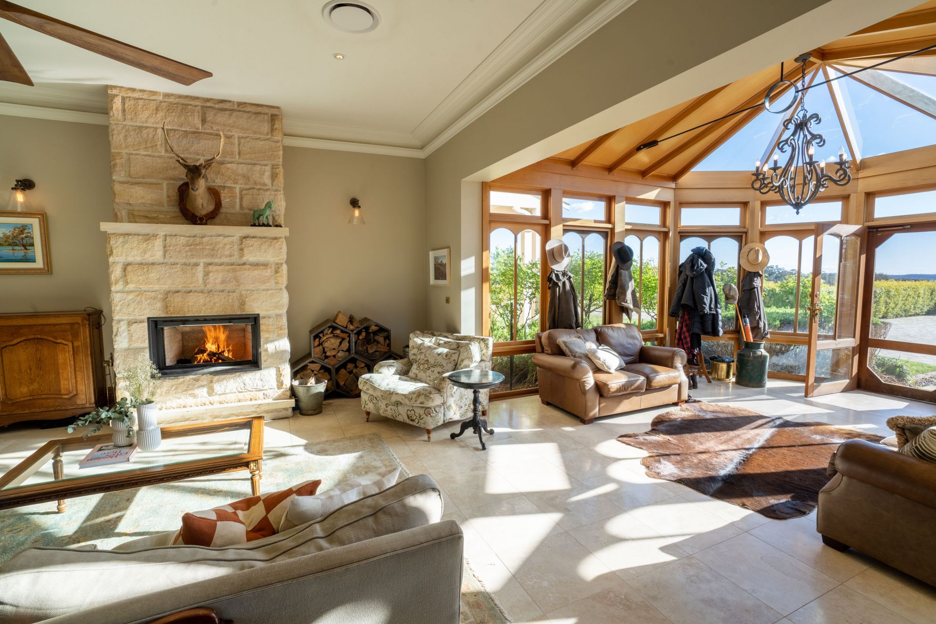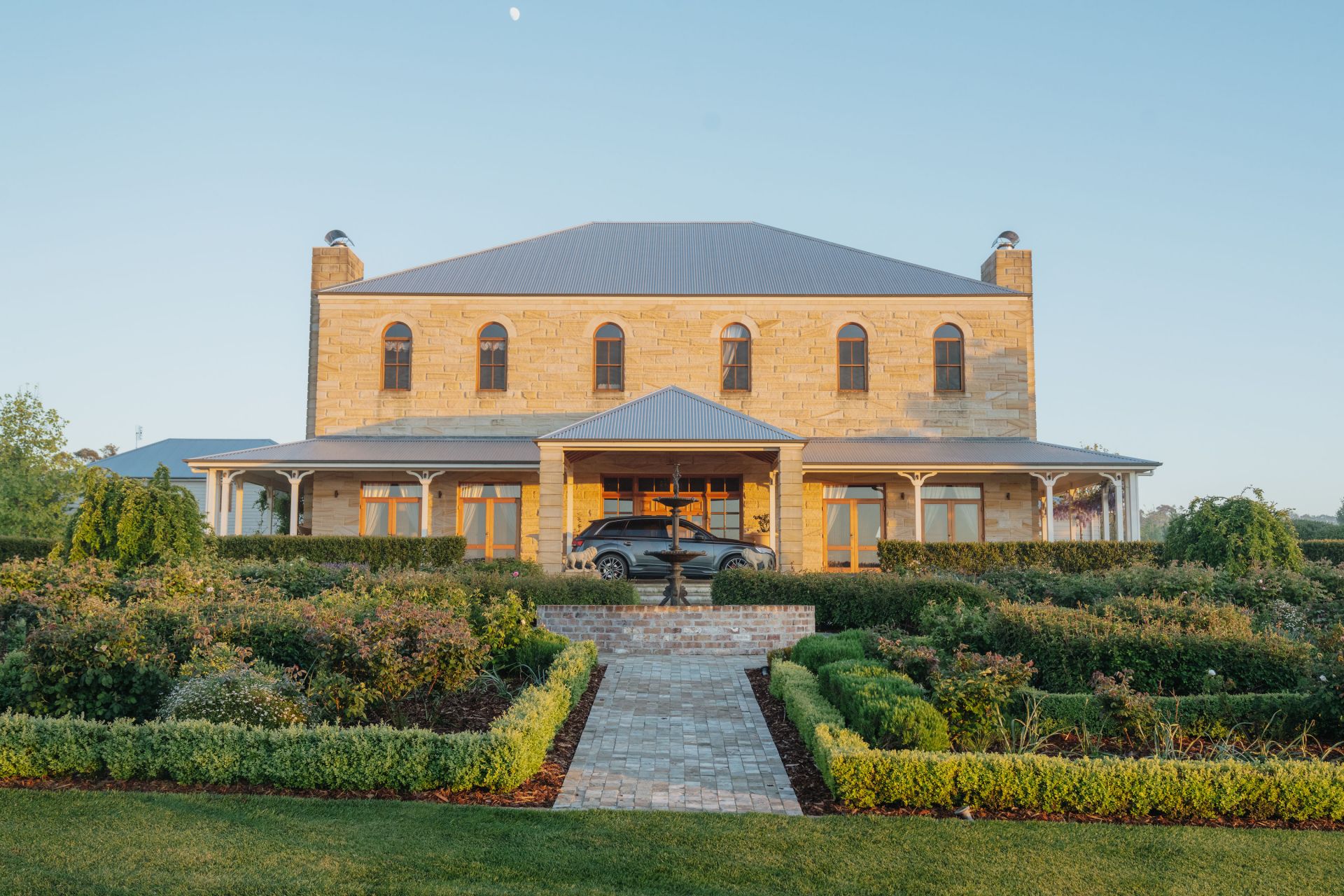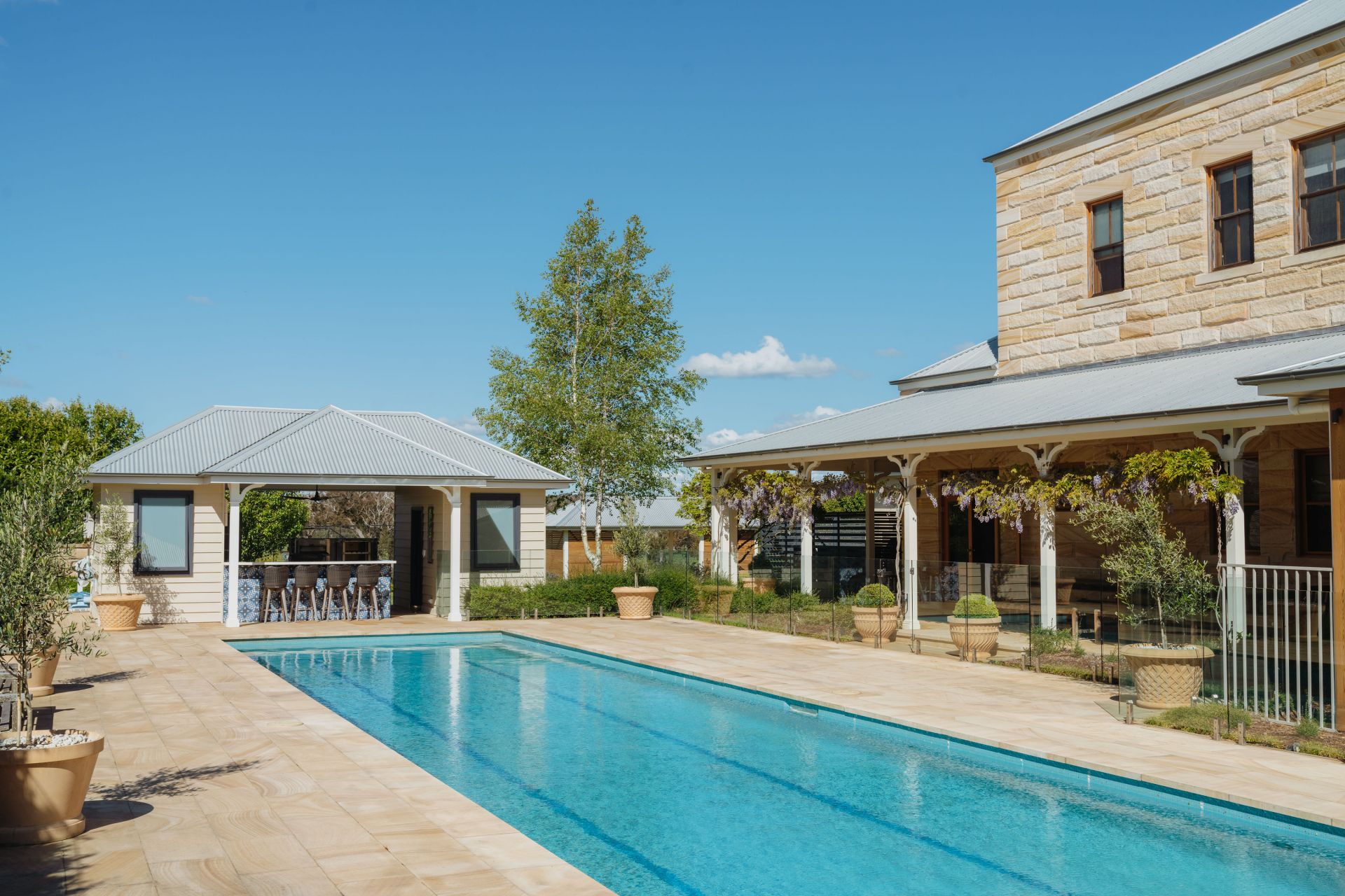 The significant two-storey, 6-bedroom homestead includes 5 bathrooms (3 ensuites) and features extensive joinery, exposed timber beams from Pyrmont bridge and 20 spacious rooms. Includes large double bedrooms, extended ballroom and a 23 seat formal dining room. The open plan kitchen and living extends to sunroom, study, billiards room and several informal sitting rooms.